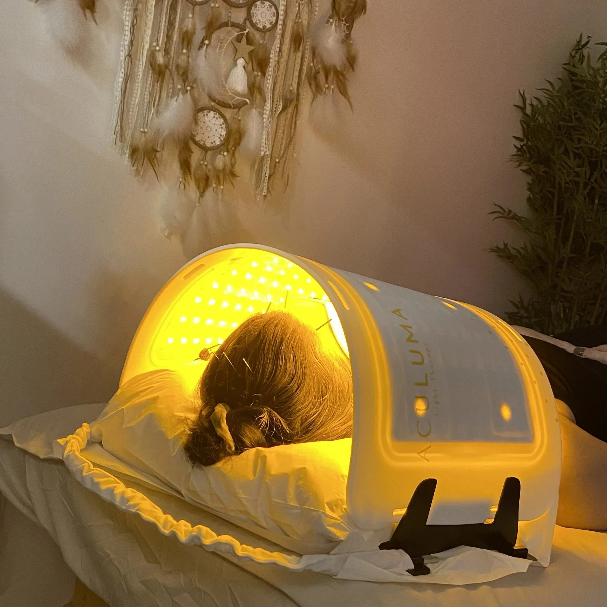 Our treatments combine facial acupuncture with the Aculuma LED Light Therapy System, which offers multiple therapeutic wavelengths—including red, blue, and near-infrared light—to support collagen production, improve circulation, calm inflammation, and enhance natural facial rejuvenation.